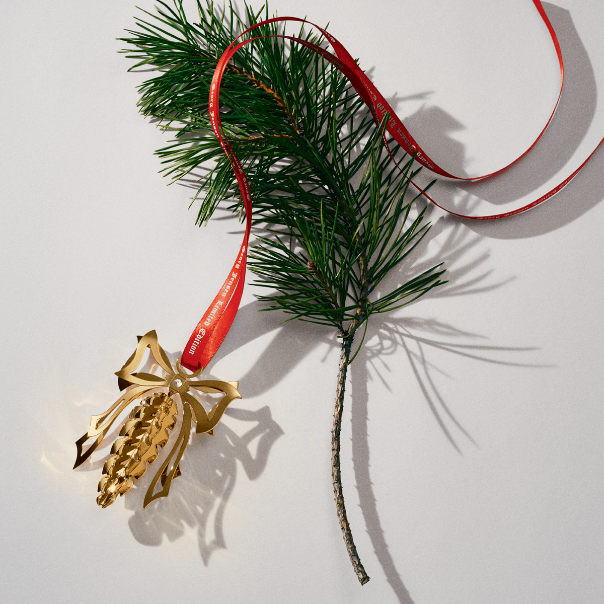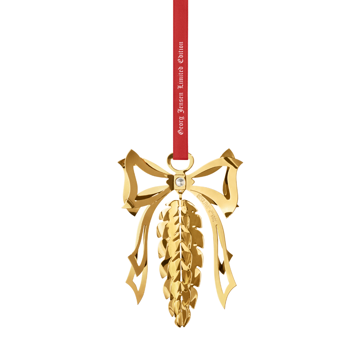 Crafted in brass and plated with 18kt gold, this ornament comes with a special edition red ribbon printed with "Georg Jensen 1995-2025." To maintain its beauty, clean with a soft brush, warm water, and mild soap, and store in a dry, warm place.
