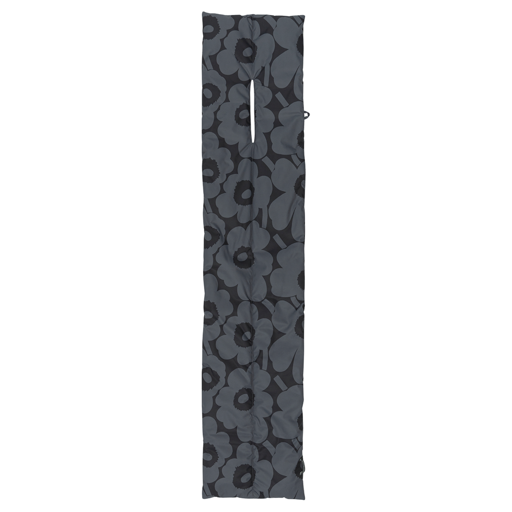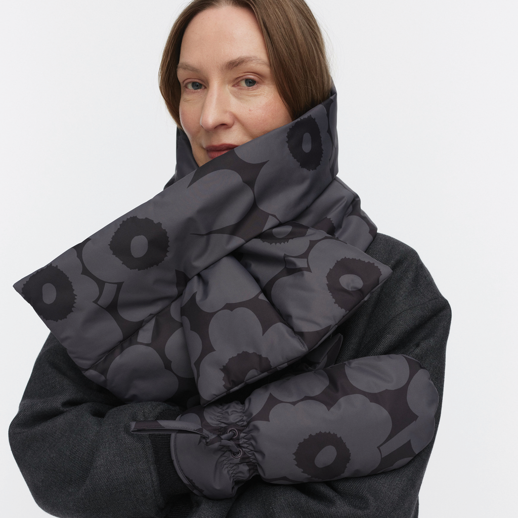 The padded Croma scarf features the Unikko pattern. The scarf is fastened by pulling one end through the slit in the central seam.
