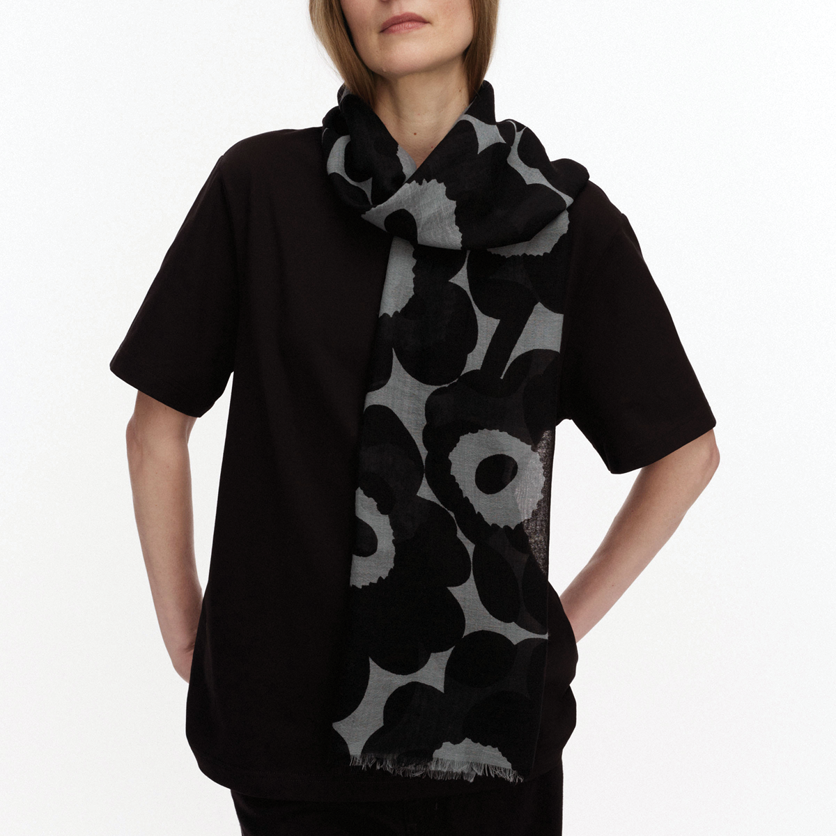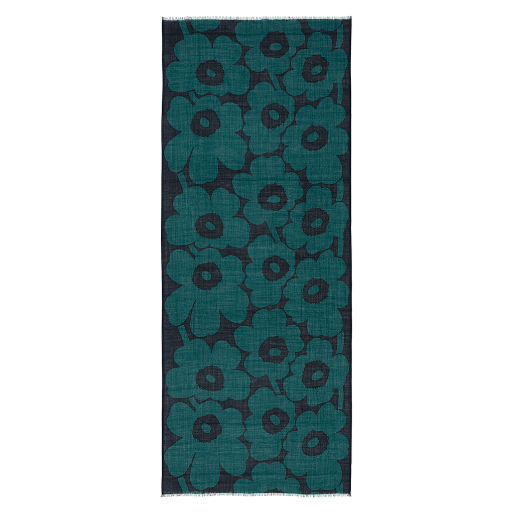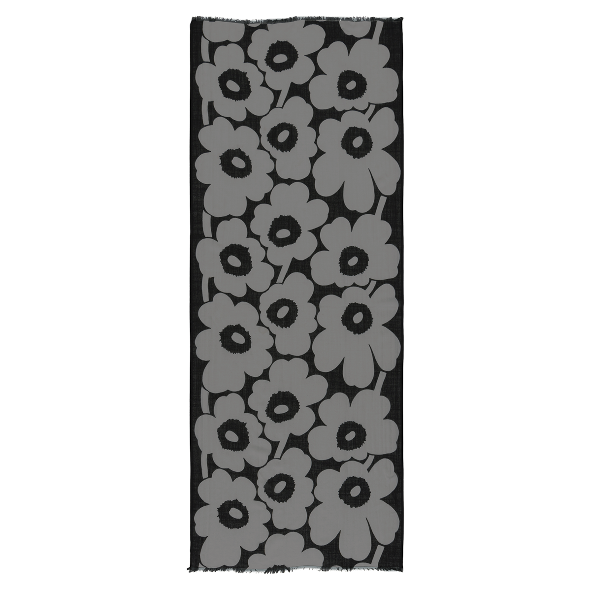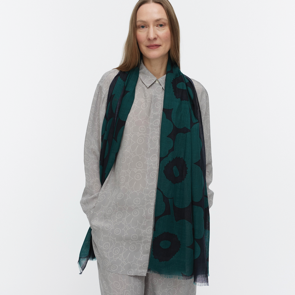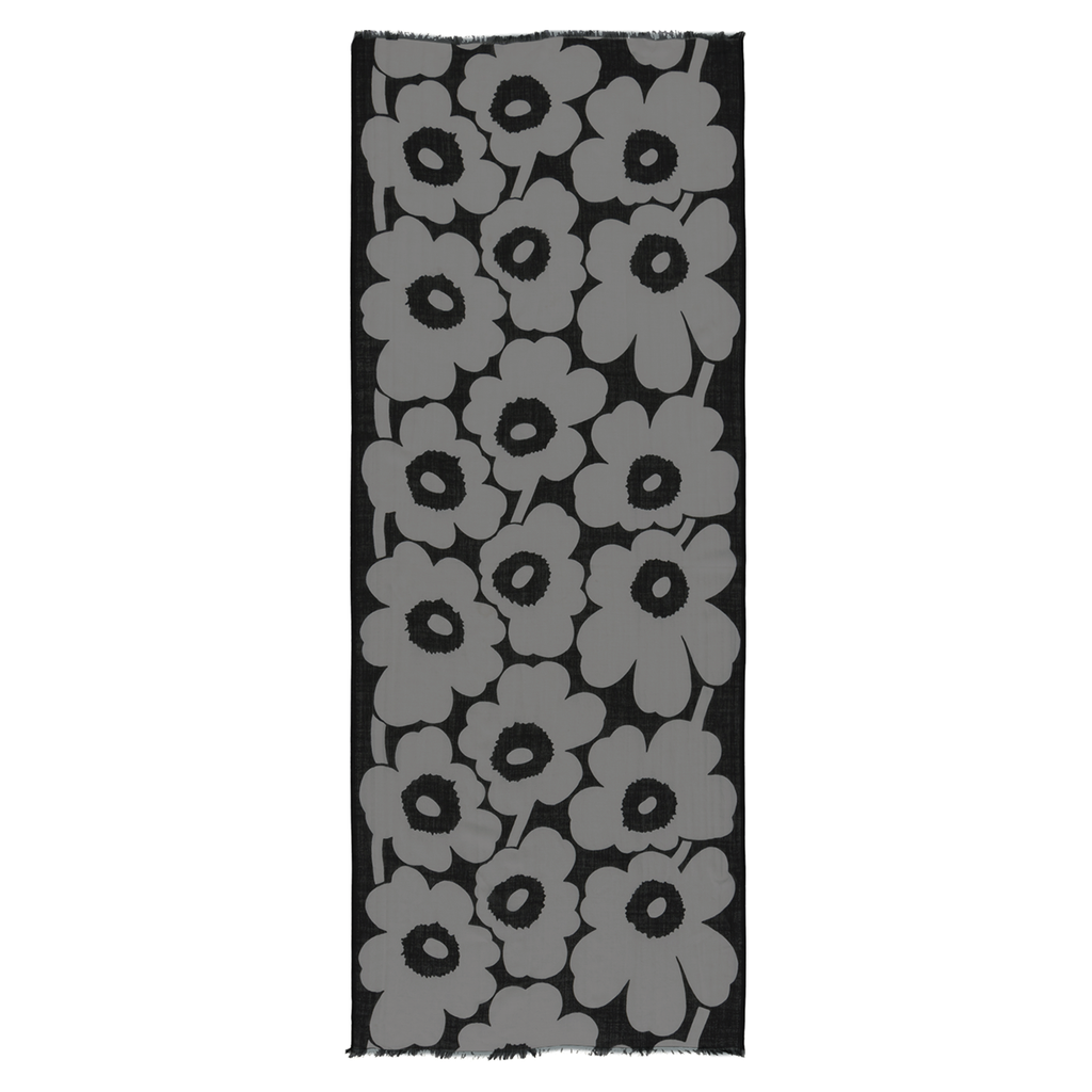 The sheer Fiore wool scarf features the Unikko pattern. The ends of the scarf are unfinished.