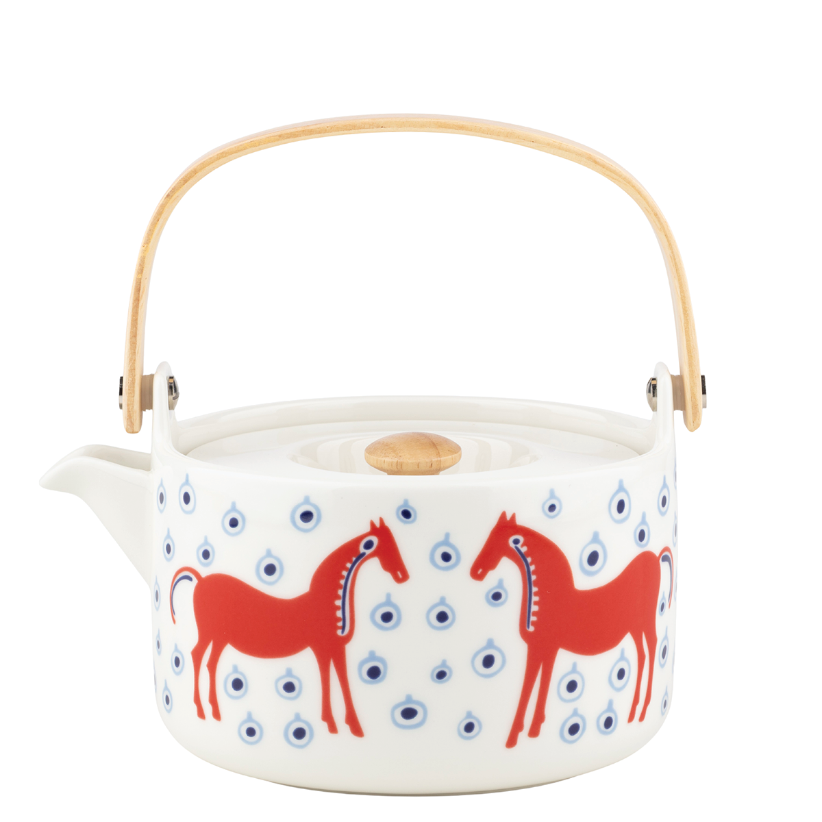 The Oiva tableware pieces feature the Musta Tamma pattern. The teapot has a ceramic strainer and a wooden handle and peg on the lid. We recommend washing this product by hand.