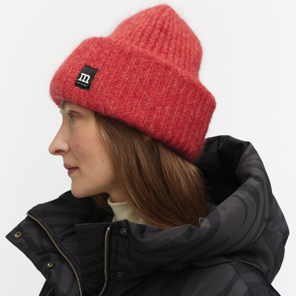 The Reivi knitted beanie is made of a mohair and merino wool blend. The thick beanie has a hem that is folded over twice. The Marimekko label is sewn on the front.