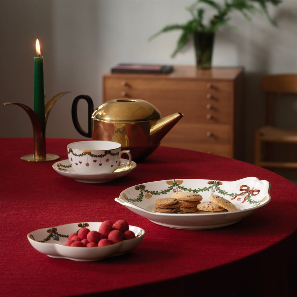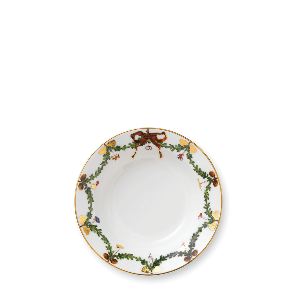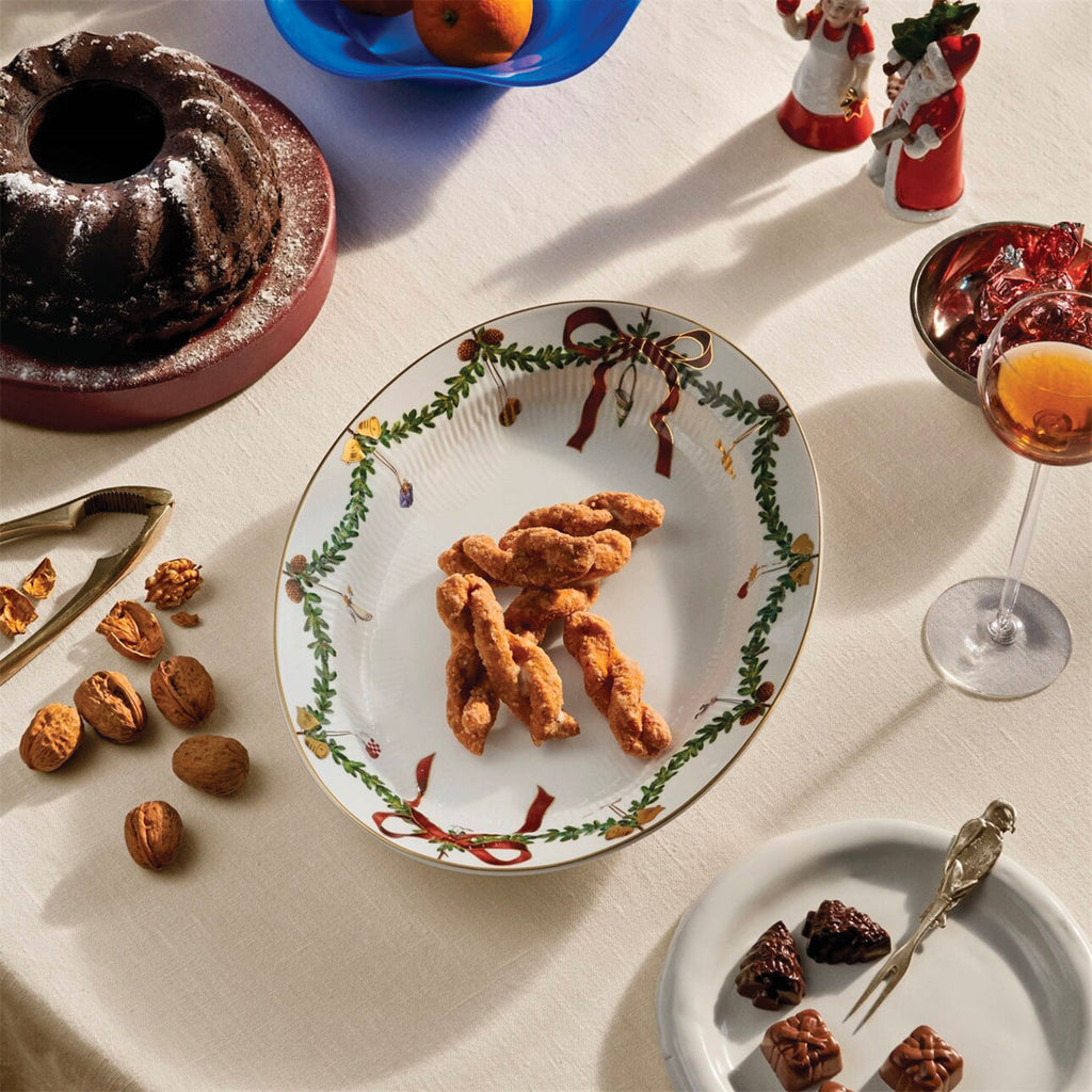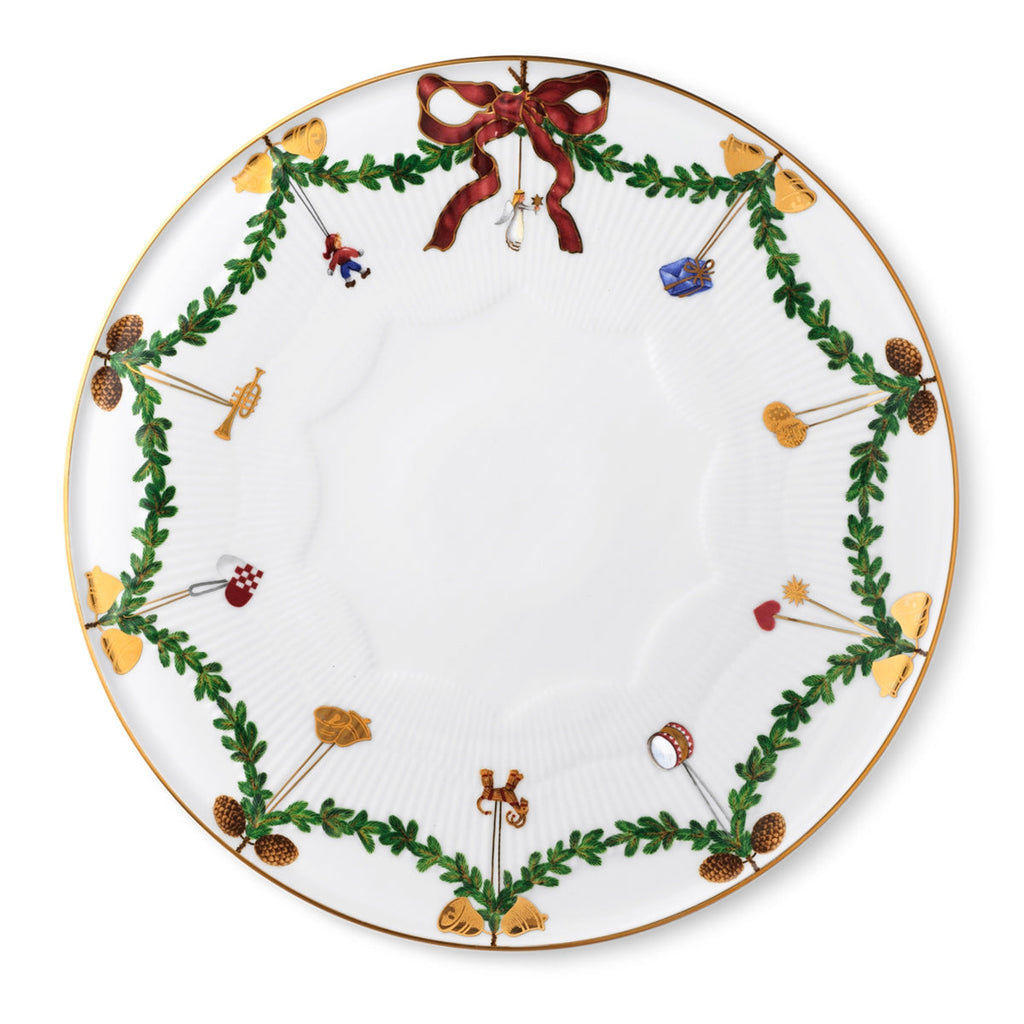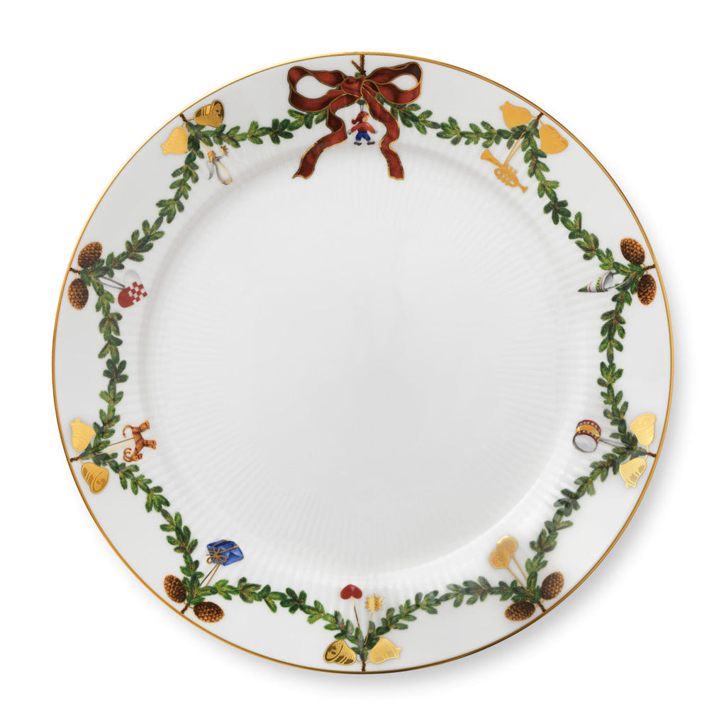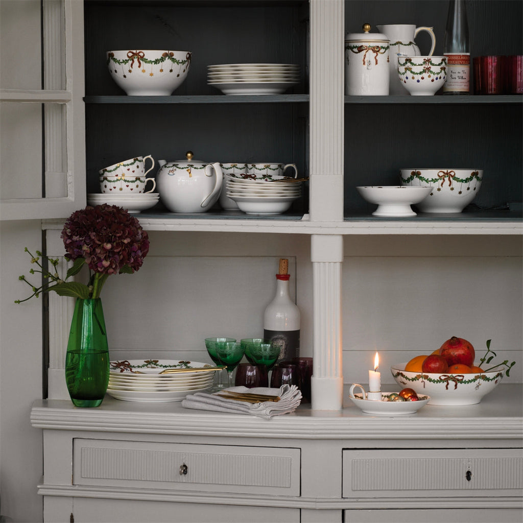 The joys of the holiday season are all here. Royal Copenhagen's Star Fluted Christmas service sees garlands of spruce wind their way around all plates, decorated with bows of satin, hearts, drums, angels—the staples of a traditional, utterly cosy Danish Christmas. No two bows are ever tied the same. On the tree, the presents or on any of these unique pieces.