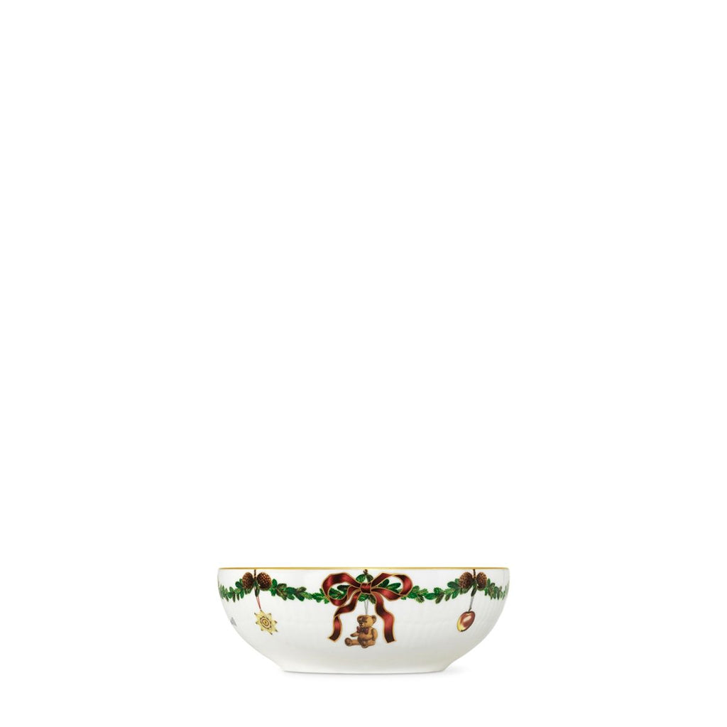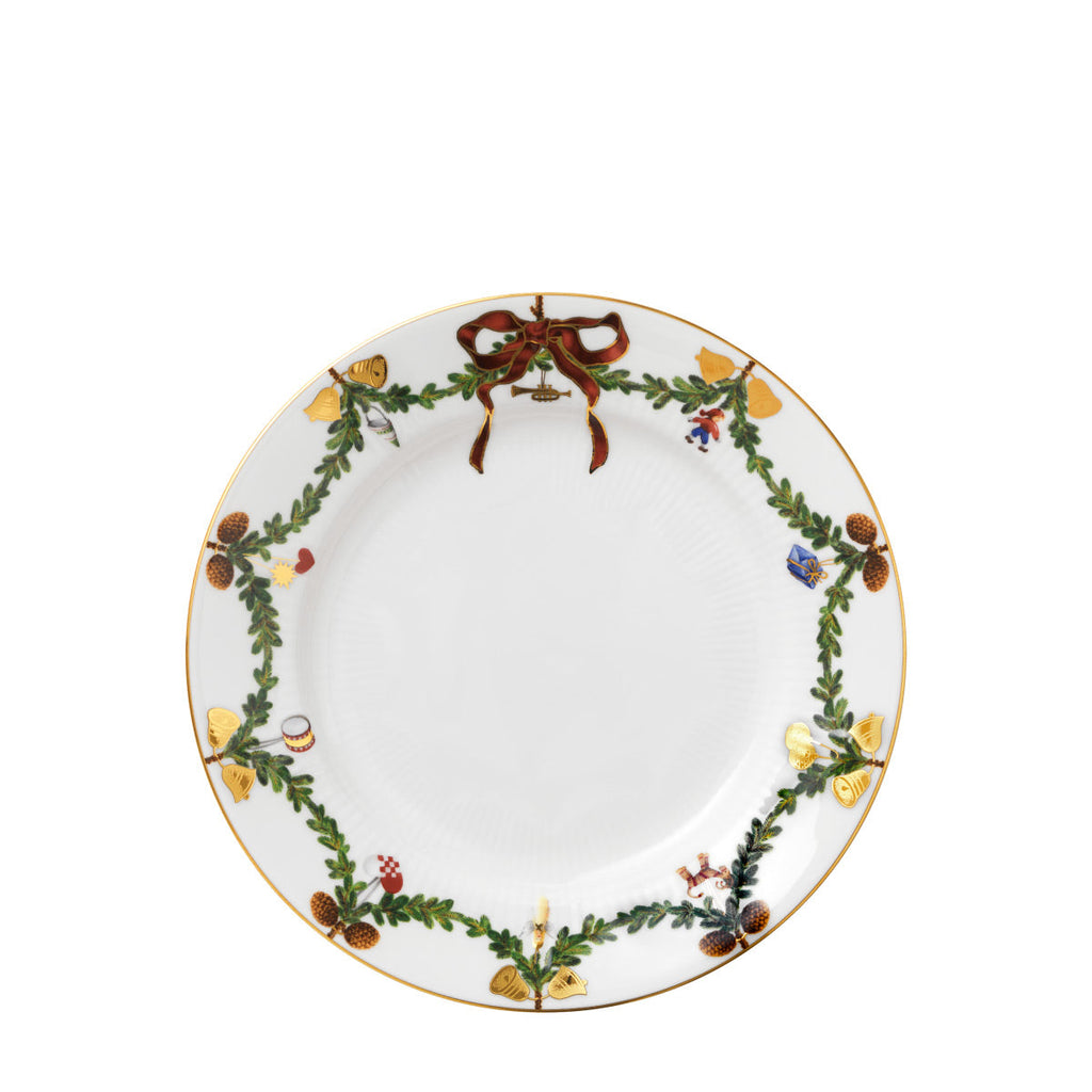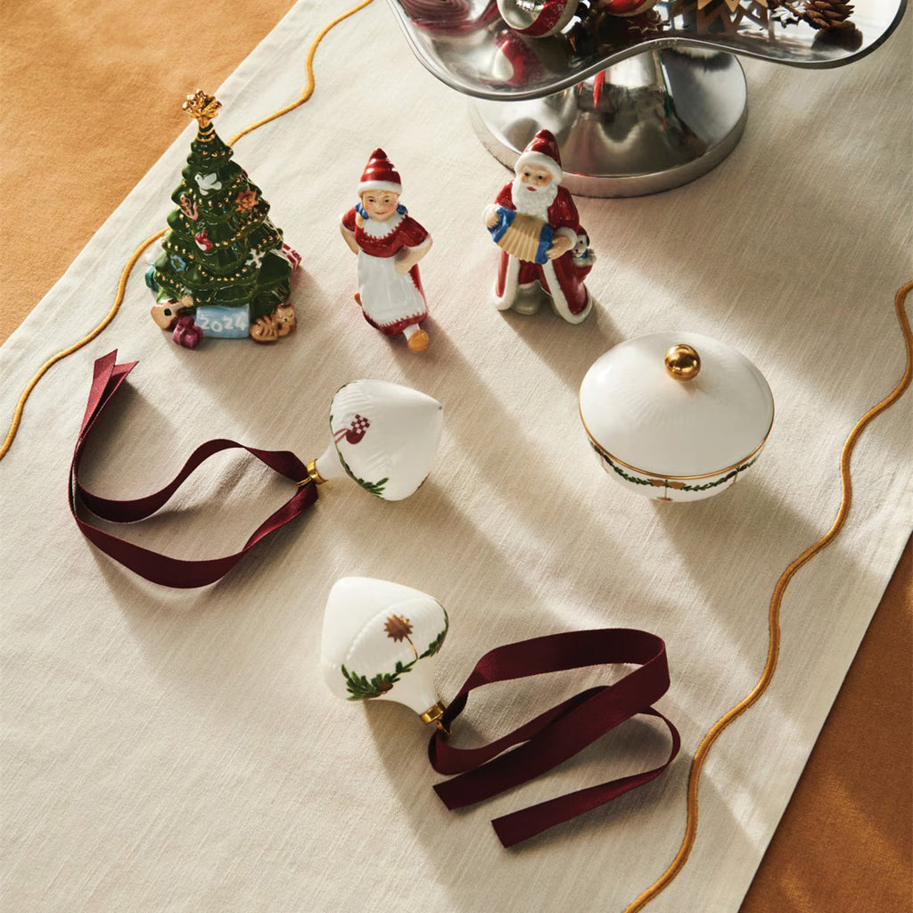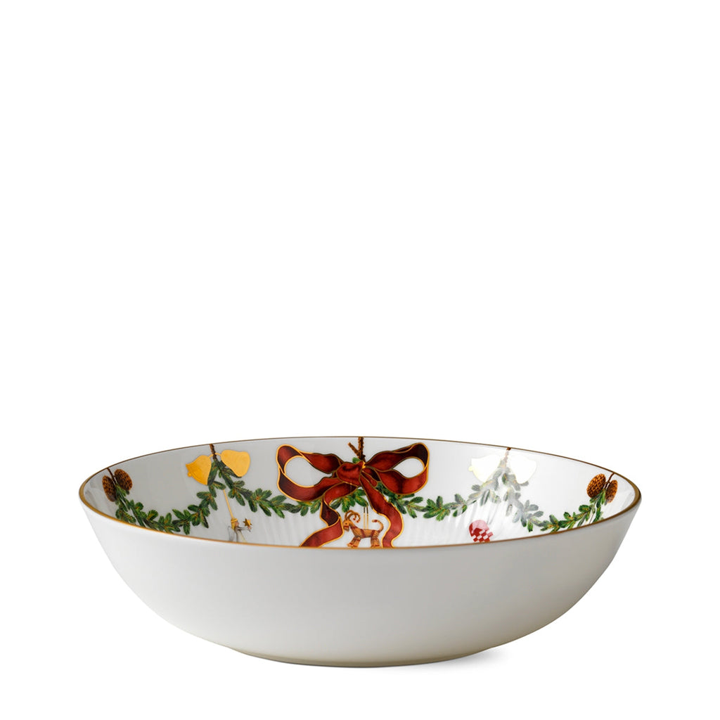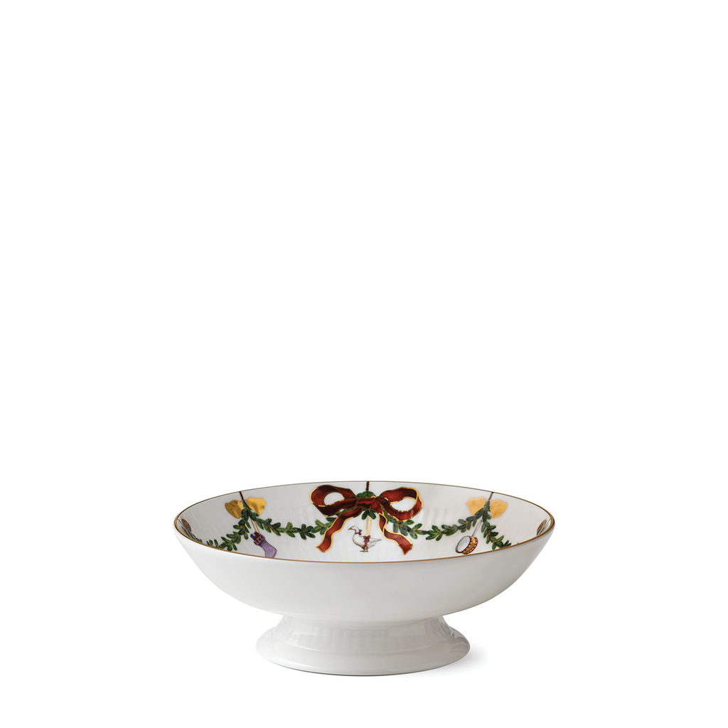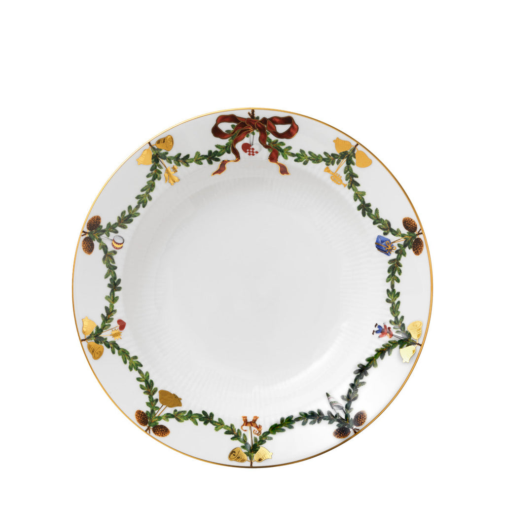 The joys of the holiday season are all here. Royal Copenhagen's Star Fluted Christmas service sees garlands of spruce wind their way around all plates, decorated with bows of satin, hearts, drums, angels—the staples of a traditional, utterly cosy Danish Christmas. No two bows are ever tied the same. On the tree, the presents or on any of these unique pieces.