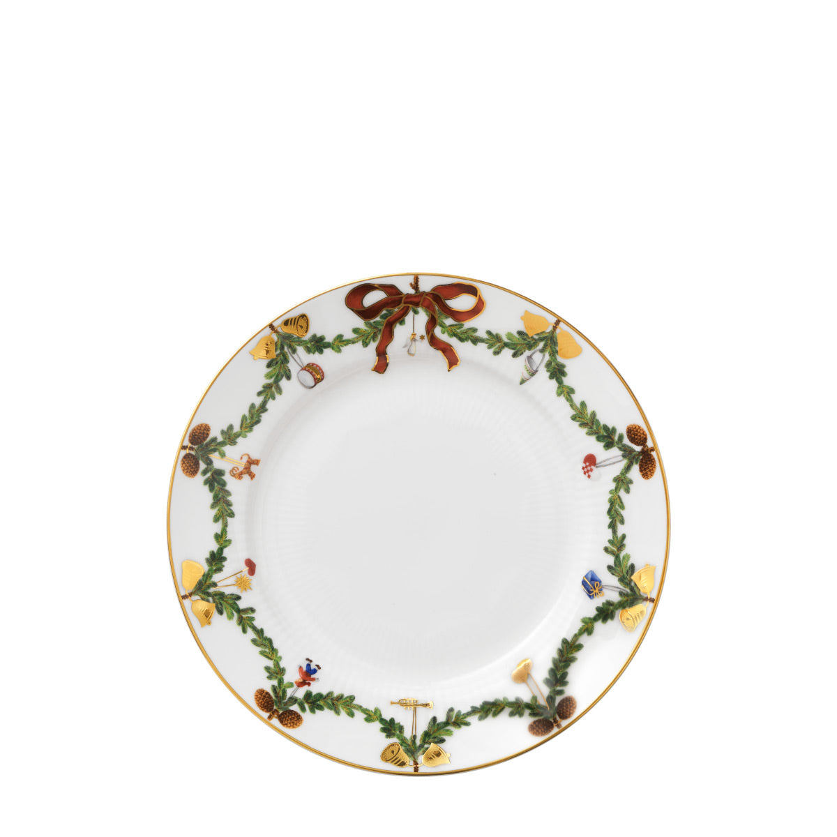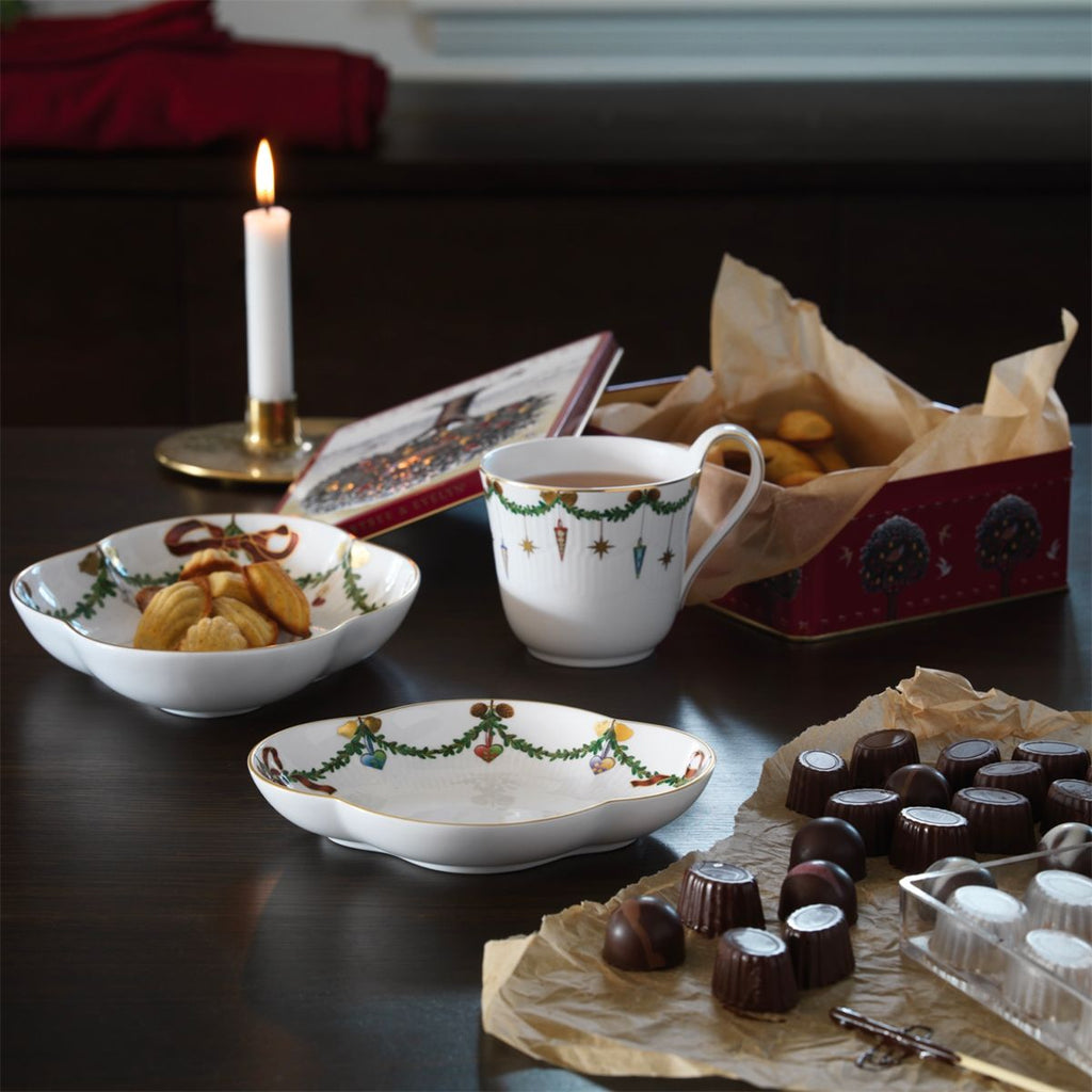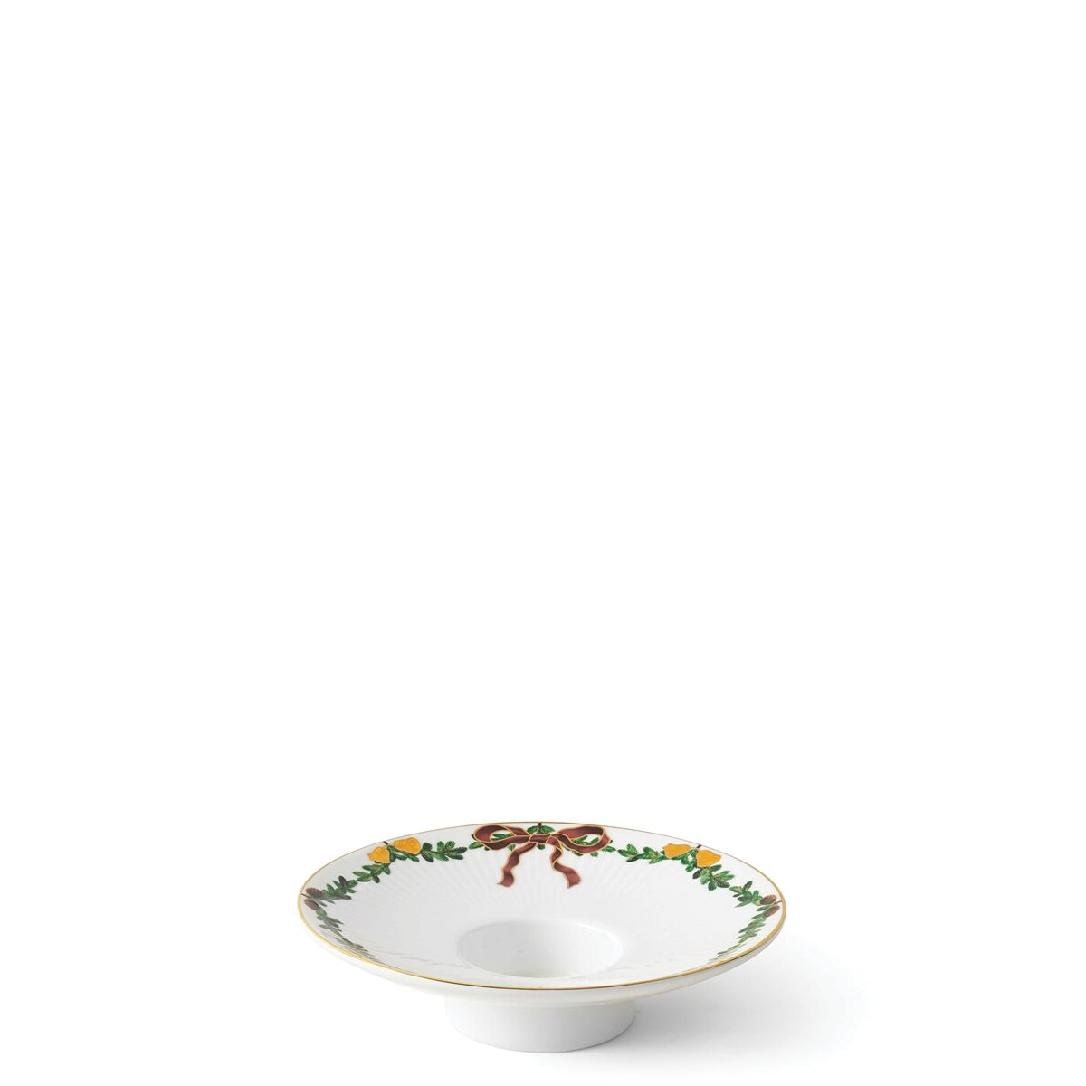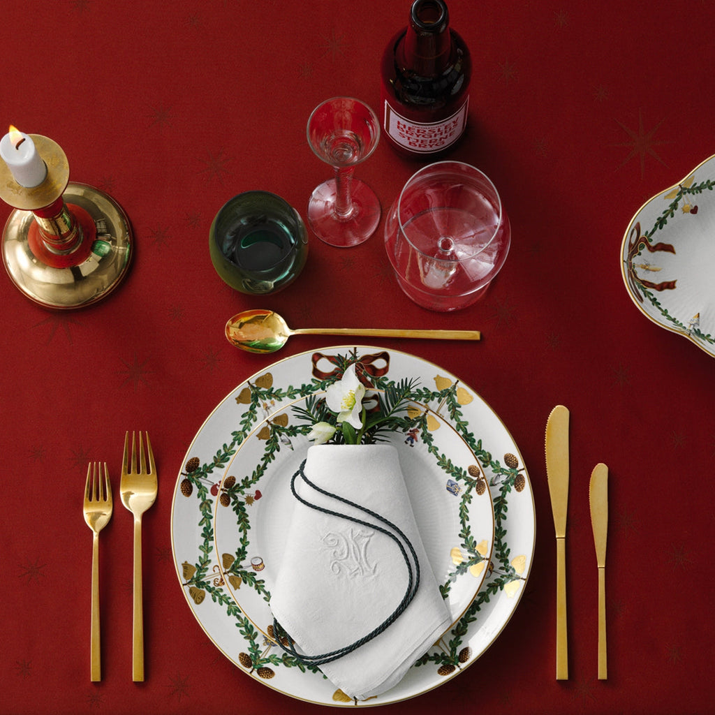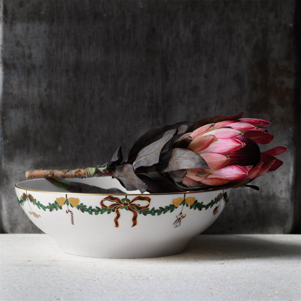 The joys of the holiday season are all here. Royal Copenhagen's Star Fluted Christmas service sees garlands of spruce wind their way around all plates, decorated with bows of satin, hearts, drums, angels—the staples of a traditional, utterly cosy Danish Christmas. No two bows are ever tied the same. On the tree, the presents or on any of these unique pieces.