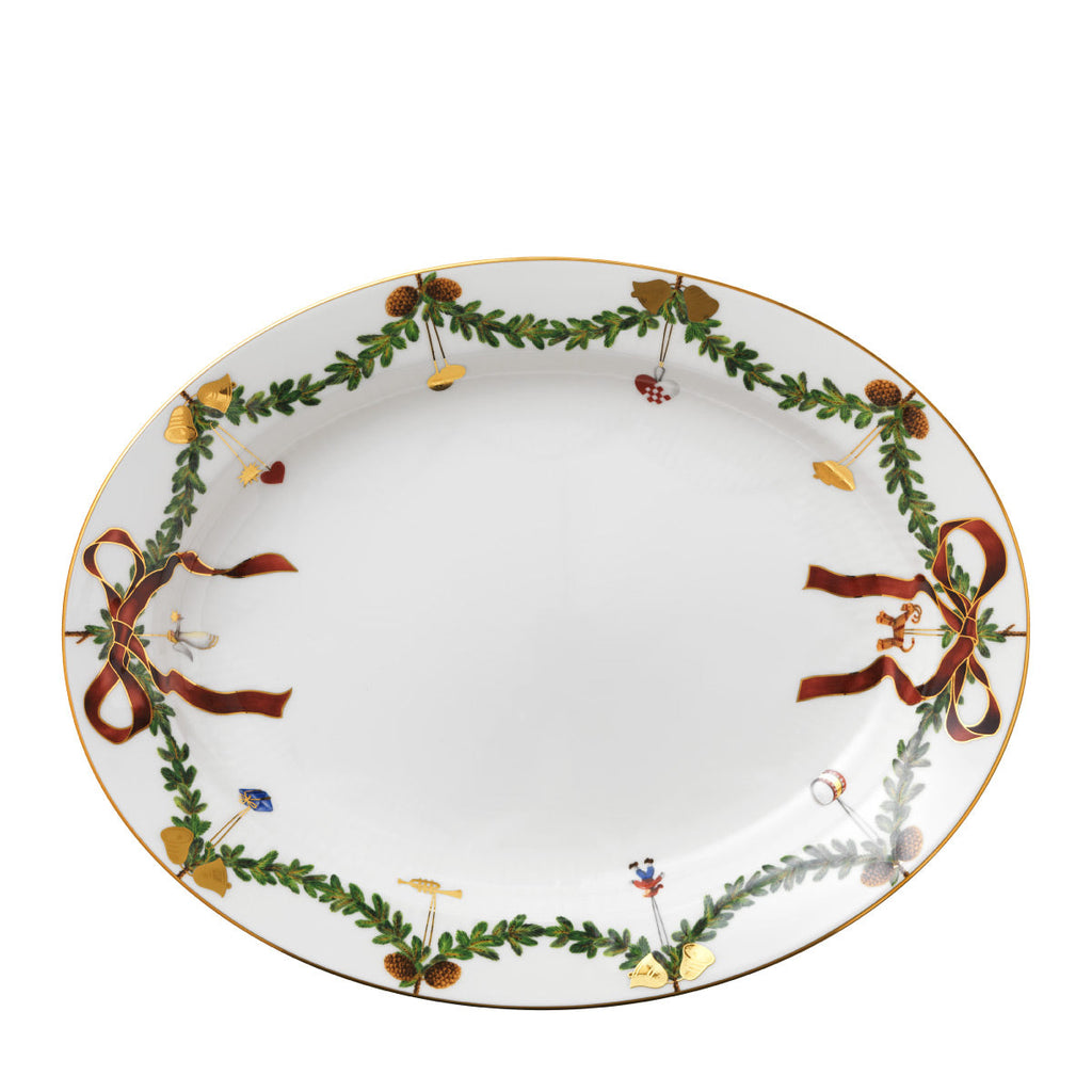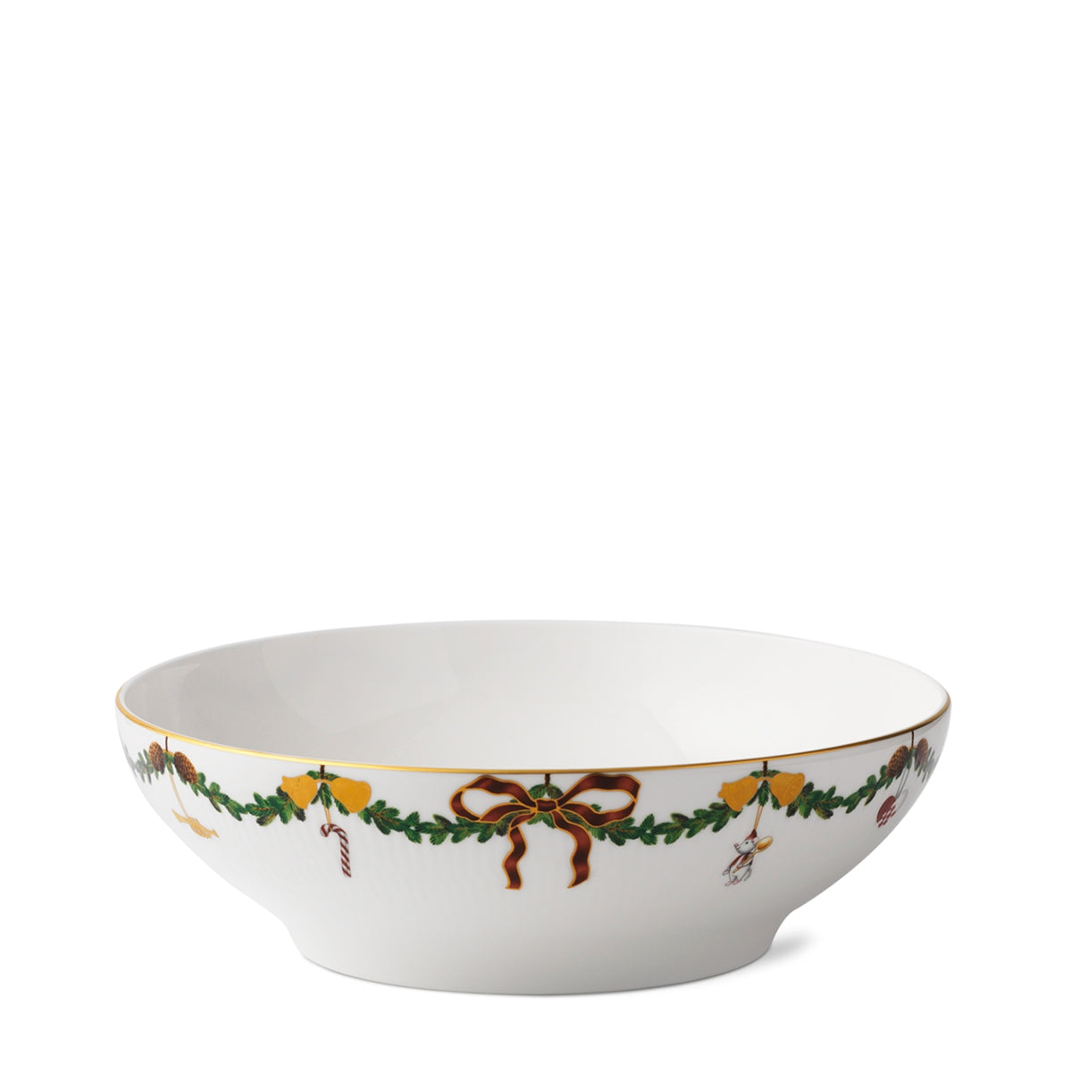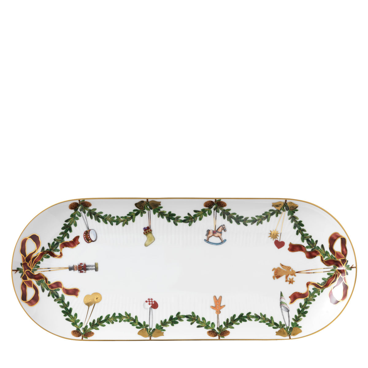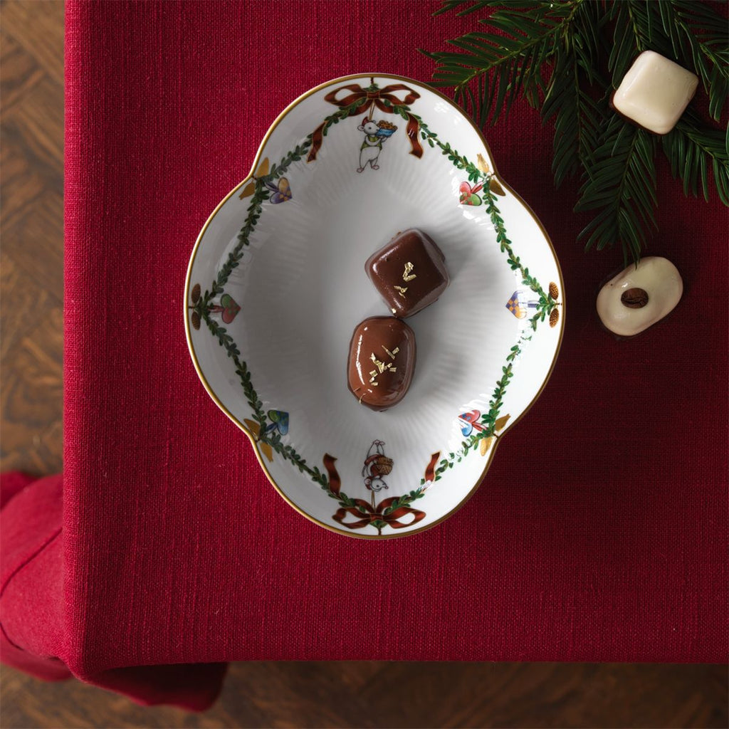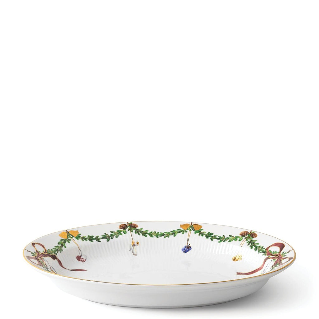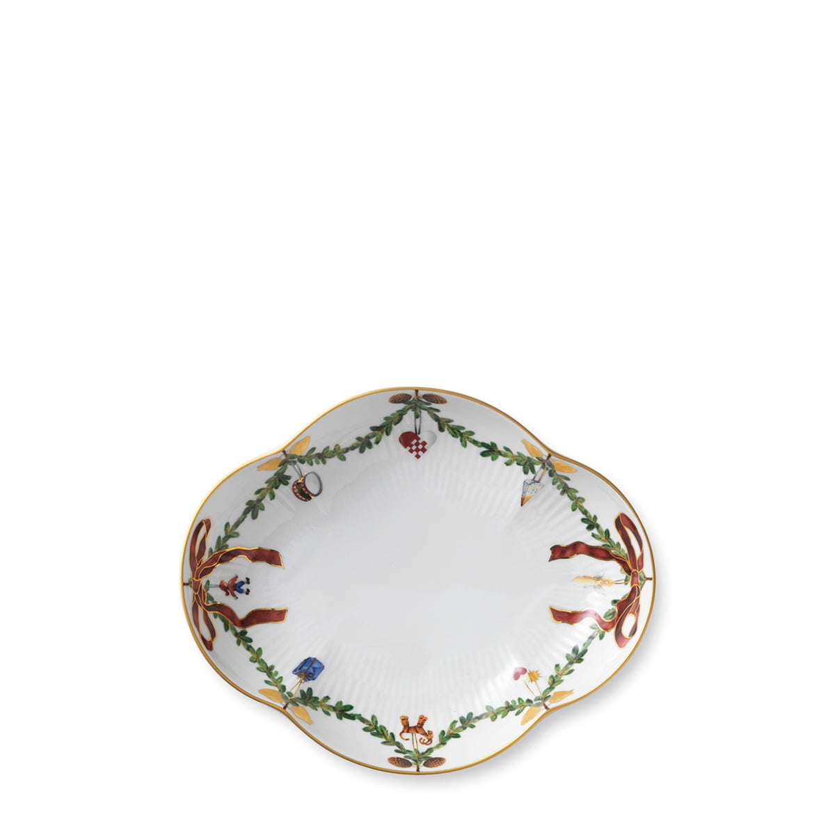 The joys of the holiday season are all here. Royal Copenhagen's Star Fluted Christmas service sees garlands of spruce wind their way around all plates, decorated with bows of satin, hearts, drums, angels—the staples of a traditional, utterly cosy Danish Christmas. No two bows are ever tied the same. On the tree, the presents or on any of these unique pieces.