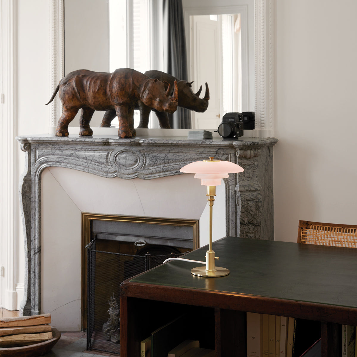 Poul Henningsen designed the three-shade system back in 1925-1926. The first lights using the system were designed by PH in cooperation with Louis Poulsen for an exhibition in Paris. This partnership continued right up until his death in 1967. Throughout his life, PH sought to create glare-free light, direct light where it was most needed, and create soft shadows, using incandescent bulbs as a light source. PH 2-1 Table is a member of the 3-shade family which numbers 30 lamps today, including three for outdoor use. Thus PH did not just design a light, but an entire system—around a thousand different models have been produced over the years. This wide selection consisted of table, floor and wall lamps, as well as a number of different chandeliers, which were very popular in the 1930s for lighting private homes from high ceilings. There were countless combination options. The lights were available in different colors, as well as a range of sizes. The first shades were made of metal with a painted undersurface, such as white, gold or silver—depending on whether diffuse, warm or cold light was desired. Glass was later introduced for the three-shade system. In addition to the downward-directed light, glass lamps illuminated the room.